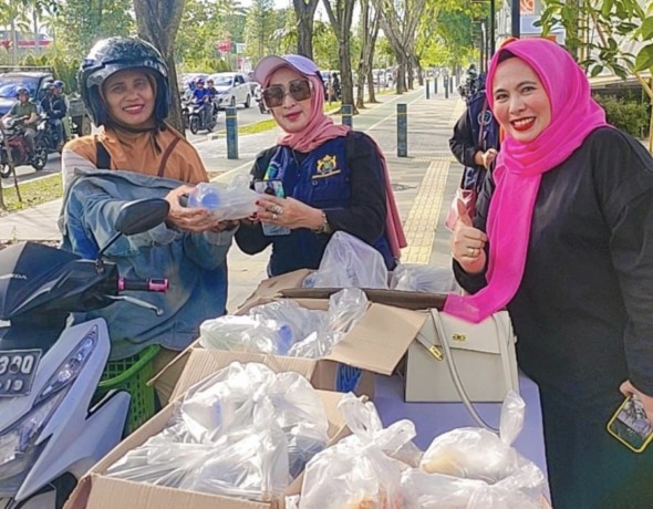 Hj Wina Handayani SE MM, Ketua Yayasan Peduli Masyarakat Khatulistiwa saat membagikan ratusan takjil gratis kepada masyarakat di Kota Pontianak. foto YPMK