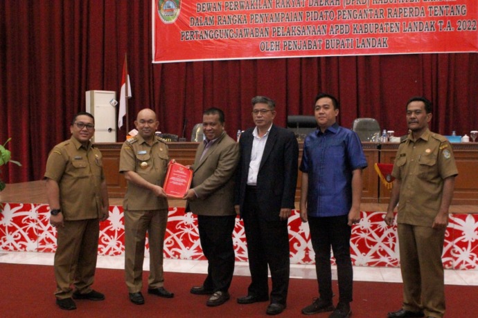 Pj. Bupati Landak Samuel menyampaikan pidato pengantar Raperda tentang laporan pertanggung jawaban pelaksanaan (LKPj) APBD Kabupaten Landak tahun anggaran 2022 di ruang sidang kantor DPD Landak, Senin (5/6).